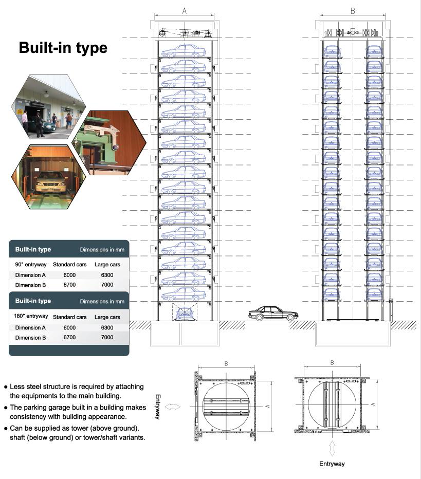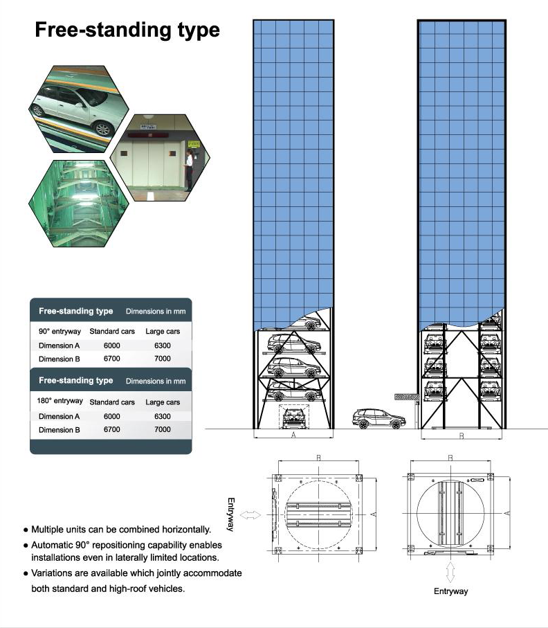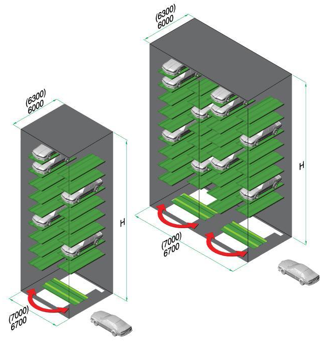 The Ryoko Lift Park permits space-saving parking by stacking vehicles above each other. With a vertical lift it is possible to park up to 52 vehicles on a base area of only 37.8 squared meters in single rows. With multiple rows on a slightly larger area, as many as 78 vehicles can be accommodated. The automatically operated lift park makes ramps and aisles unnecessary, offers protection against theft and vandalism, saves on the expensive building technology compared with conventional buildings, and is environment-friendly in terms of its compact construction.